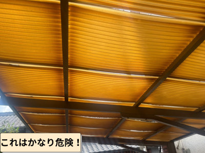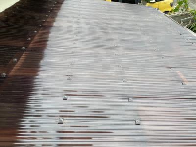 一見すると破れや大きな割れはないように見えますが、近くで確認すると色褪せなど劣化で波板が反ったりなど現状があります。
