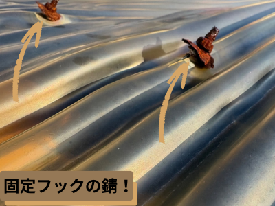 塩ビは釘周りから亀裂が入り、そこから破れて 風で飛散する危険 が高いです。