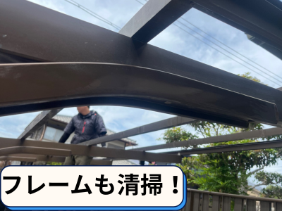 波板交換工事の際、弊社では フレーム部分(アルミ・スチール・鉄骨部分)も必ず清掃 しています。(他の業者では波板を張り替えて終わりなどで終わりですが弊社は全体に洗浄致します。)